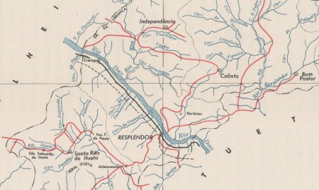 ACIMA: Mapa (parcial) do município de Resplendor durante os anos 1950. O local onde fica a estação de Crenaque está no mapa, a noroeste da sede do municipio, (IBGE: Enciclopedia dos Municipios Brasileiros, vol. VII, 1960).