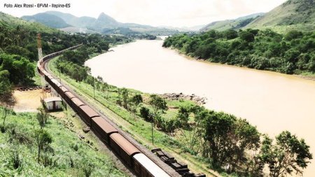 O trem da EFVM passa ao longo do Rio Doce próximo à