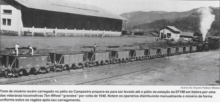ACIMA: Pátio do Campestre em 1948 - CLIQUE SOBRE A FIGURA PARA VÊ-LA EM TAMANHO MAIOR (foto do Arquivo Publico Mineiro). O texto é de Eduardo José de Jesus Coelho e João Bosco Setti, de seu livro (2000) A E. F. Vitoria a Minas - suas locomotivas desde 2004, volume 1, p.33).