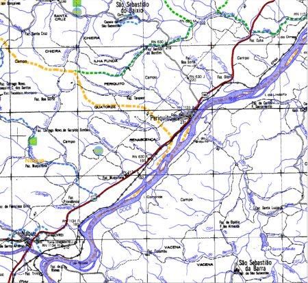ACIMA: A ferrovia passa à esquerda do rio Doce pelas cidades e estações de Periquito (quase no centro do mapa) e Naque (no canto inferior esquerdo) em 2010 . A estação de Manuel Pereira deveria estar entre Periquito e a borda leste no alto do mapa - mas parece que nada sobrava neste ano) - CLIQUE SOBRE A FIGURA PARA AMPLIÁ-LA).