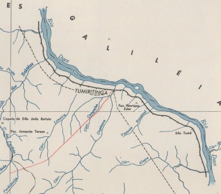 ACIMA: No mapa (parcial) do município de Tumiritinga, aparecem duas (sede e São Tomé) das três estações que estão em seu território (a que não aparece é a de Severino de Oliveira) (IBGE: Enciclopedia dos Municipios Brasileiros, 1960). |