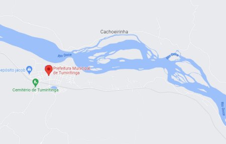 ACIMA: A sede do municipio de Tumiritinga, o rio Doce e o loccal onde fica a Cachoeirinha, que deu o nome antigo da cidade (Google Maps, 2022).