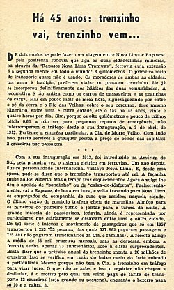 os dias de hoje. Antonio Gorni escreve que '"a idéia de se construir uma linha férrea entre a estação ferroviária de Raposos e Nova Lima surgiu da necessidade de facilitar o acesso de máquinas, equipamentos e insumos à mina, cuja expansão era cada vez maior. Além disso, o crescimento da mina havia resultado num grande aumento do número dos operários que nela trabalhavam, criando problemas habitacionais na região. A administração da Mina de Morro Velho constituiu a The Morro Velho Railway Co. no final da primeira década do século XX com o objetivo de se concretizar essa ligação, que recebeu o privilégio de explorar essa concessão por cinqüenta anos. Suas obras se iniciaram a 30 de Março de 1911. Não há certeza quanto à data da inauguração dessa ferrovia: Waldemar Stiel e Allen Morrison citam 25 de março de 1913, enquanto que Demerval Pimenta informa 3 de Abril de 1914. Como era comum na época, as condições técnicas da linha não eram das melhores: bitola de 0,66 m e curvas de até 47 m de raio. Contudo, apresentava uma grande inovação para as ferrovias brasileiras: ela já iniciou sua operação totalmente eletrificada, fato raríssimo no país. Ela também foi a segunda ferrovia a usar tração elétrica no Brasil, sendo precedida somente pela E.F. Corcovado. Certamente a eletrificação da E.F. Morro Velho decorreu da abundância de energia elétrica na região, uma vez que a mina dispunha de uma usina hidrelétrica própria. Essa recursos permitia dispensar o uso da lenha na ferrovia, que vinha se tornando cada vez mais cara e escassa a partir do início do século XX, e do carvão importado, de custo proibitivo. O material rodante foi fornecido pela General Electric, que estava se revelando uma potência dominante na área da tração elétrica e que teria um brilhante desempenho nas ferrovias brasileiras. A E.F. Morro Velho adquiriu sete locomotivas, sendo quatro de 4 t e três de 3,75, seis carros-reboque abertos e quatorze vagões. O serviço de passageiros entre as duas localidades era público, embora predominasse o transporte gratuito dos empregados da mina; uma composição circulava entre elas de quarenta em quarenta minutos. A estrada também servia um pequeno povoado no meio do percurso chamado Galo, onde a Companhia Morro Velho tinha uma fábrica de arsênico. Três vezes por mês o serviço era interrompido, tropas ocupavam toda a linha e composições especiais circulavam por ela levando lingotes de ouro que eram baldeados para trens da Central do Brasil rumo ao Rio de Janeiro. A concorrência rodoviária fez com que o transporte de passageiros pela E.F. Morro Velho definhasse ao longo das décadas de 1950 e 1960. O serviço passou a ficar cada vez menos atrativo do ponto de vista econômico, até que a Companhia Morro Velho decidiu desativá-lo no último dia de 1964, alegando prejuízos e a irregularidade jurídica da operação da ferrovia, cuja concessão havia vencido e não havia sido renovada. O anúncio da paralisação provocou ameaça de greve por parte dos funcionários da empresa; a Prefeitura de Nova Lima então o assumiu em 1° de Janeiro de 1965. Apesar de toda a resistência, em 1970 a ferrovia foi suprimida, seus trilhos arrancados e substituídos por uma rodovia. Não há notícias sobre preservação de locomotivas ou carros que foram usados nessa linha" (resumido do site www.pell.portland.or.us/~efbrazil/electro/efmv.html). |