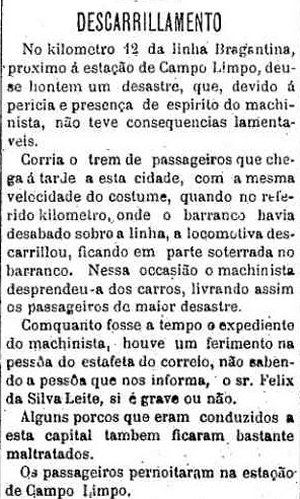 AO LADO: Apesar de a estação de Iara ainda não ecistir na época, o desastre ocorreu bem perto ao local, a 12 quilômetros de Campo Limpo, início da Bragantina (O Estado de S. Paulo, 10/3/1894)
