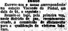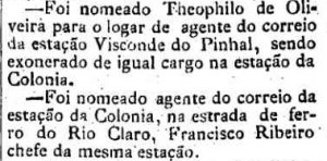 AO LADO: Troca do agente do correio na estação de Visconde do Pinhal (que mais tarde tornar-se-ia Ibaté). Não confundir com a de Conde do Pinhal, que também aparece na notícia com o nome de Colonia, que era seu nome na época (A Provincia de