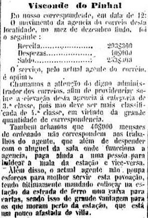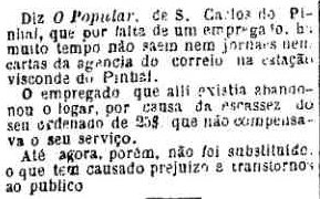 AO LADO: O correio não está funcionano a contento na estação, muito longe da vila (no caso, a vila era São Carlos, pois Visconde de Pinhal ainda não era vila, mas apenas um bairro rural afastado de São Carlos ((O Estado de