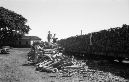 ACIMA: Vagões lenheiros em Iracema em 1937 . Ao fundo, casas de turma (Foto: Antonio de Salles Penteado (1890-1965); cessão Ricardo Penteado).