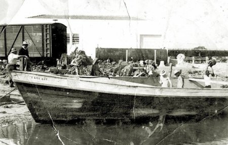 direita, lanchas com bananas trazendo a mercadoria das fazendas