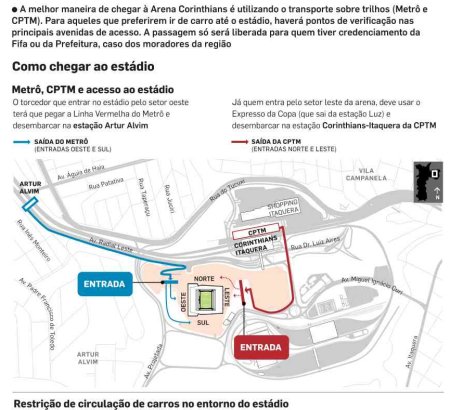 ACIMA: Esquema de ligações Estação do Metrô-Iraquera da CPRM e entrdas para o estádio do Corinthians em 2004 - CLIQUE SOBRE A FIGURA PARA VER EM MAIOR TAMANHO (O Estado de S. Paulo, 19/6/2014). |