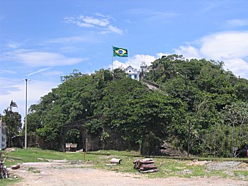 direita, junto ao centro da cidade, o morro com o antigo convento em cima. Abaixo,