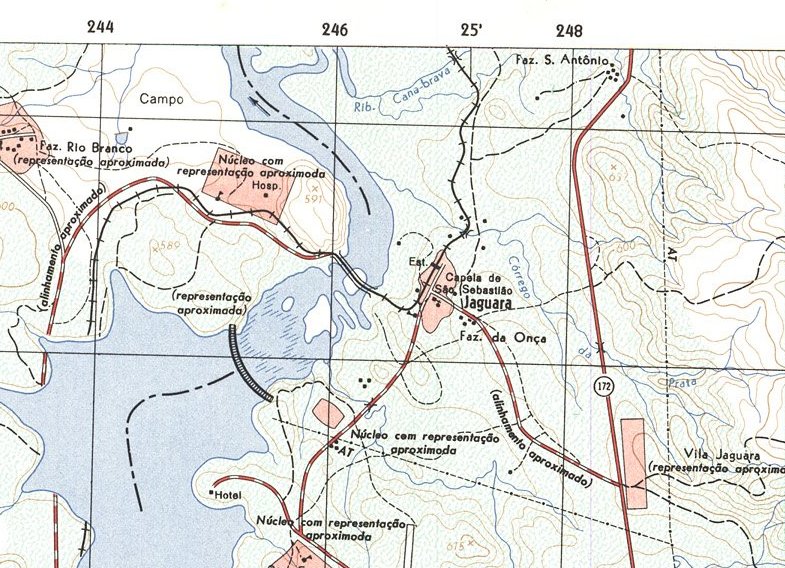 ACIMA: A estação de Jaguara, no centro do mapa dos anos 1970. Notar a linha de Mogiana com os pedaços fora da represa - que já a havia sido inundada em 1970 - ver canto esquerdo inferior do mapa e, depois, continunado mais para cima, à esquerda e aí atravessando o rio Grande (a ponte se manteve, mas inoperante) e chegando à estação. Dali para a frente a linha ainda seguiu funcionando até 1976 - CLIQUE SOBRE A FIGURA PARA VÊ-LA MAIOR - (IBGE).