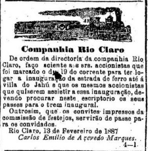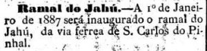 AO LADO: Anuncio da inauguração do ramal e estação de Jaú para o dia 1° de janeiro de 1887, que acabou não acontecendo neste dia (A Provincia de
