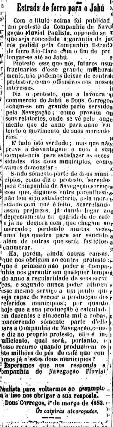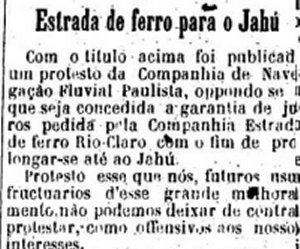 AO LADO: A construção do ramal teve opiniões contrárias e a favor da já existente navegação do Tietê: falta de visão dos "caipiras" da região - CLIQUE SOBRE O TEXTO PARA LER A NOTÍCIA TODA (A Provincia de