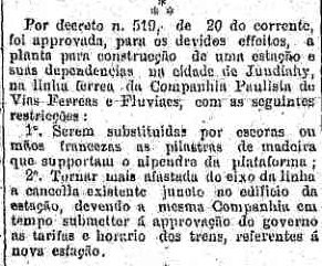 AO LADO: As obras a serem feitas para reformar o prédio que irá se tornar a estação de Jundiaí Paulista (O Estado de S. Paulo, 25/1/1898). |