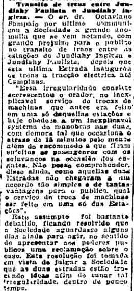 AO LADO: Jundiaí Paulista teve de alterar sua rotina para mudar as locomotivas a vapor da SPR para as novas elétricas da Paulista (O Estado de S. Paulo, 24/7/1922). |