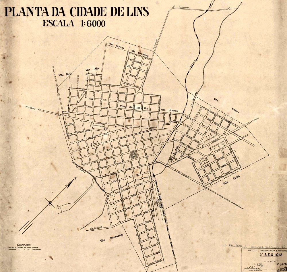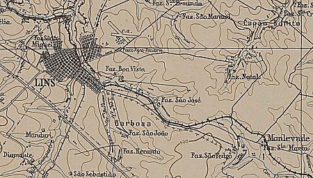 ACIMA: A cidade de Lins e a estação de Monlevade (esta no lcanto direito inferior do mapa) em mapa de 1956 (IGC-Instituto Geografico e Cartografico