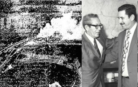 ACIMA: (À ESQUERDA), o incêndio em depósitos da Noroeste no pátio ferroviário de Lins (ainda a estação velha) causado por sucessivas explosões em 1953. A fotografia é péssima, mas serve para mostrar que o depósito (onde se origina a fumaça) ficava junto à rotunda da Noroeste, que ainda hoje existe, abandonada) e pode ser vista na foto (Folha da Manhã, 21/7/1953). (À DIREITA) O gerente da Shell, José Ramalho (de óculos) e meu sogro (sem óculos), também funcionário da empresa na época do incêndio (Foto tomada em 1980, vinte e sete anos depois do sinistro). CLIQUE SOBRE A FIGURA PARA VER A REPORTAGEM SOBRE O INCÊNDIO.