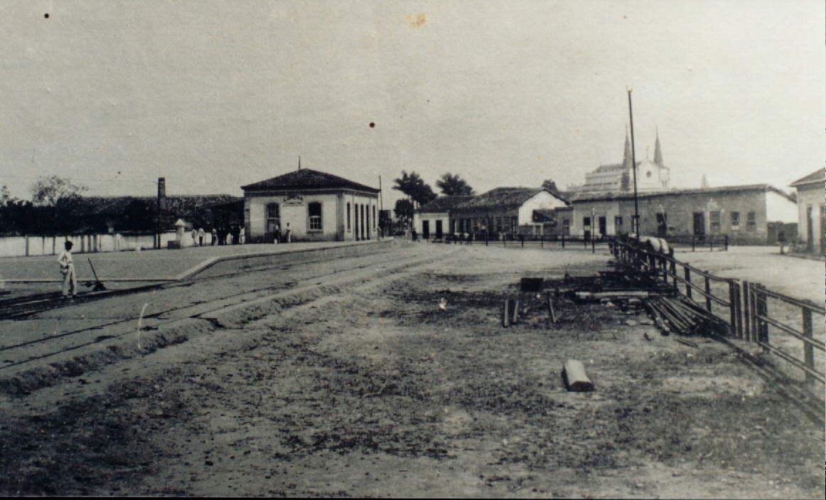 ACIMA: Estação e pátio nos anos 1930 . Ao fundo, junto à estação, o trem do ramal de Piquete. (Autor desconhecido).