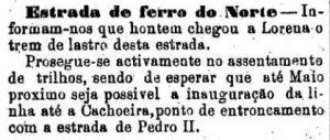 AO LADO: O trem de lastro da EFN chega até a estação de Lorena, ainda não inaugurada. Esta seria realizada efetivamente no início de julho e não em maio como então previsto (A Provincia de S.