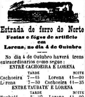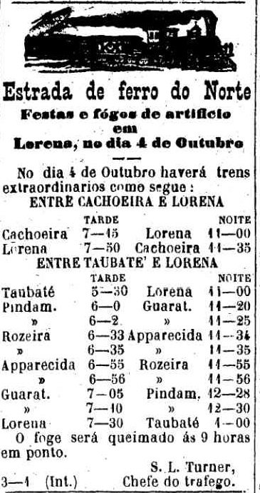 ACIMA: Trens especiais para Lorena nas festas da cidade em 1884 (A Provincia de S. Paulo em 7 de fevereiro).