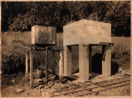 ACIMA: Caixa d'água na estação de Santa Maria, no início dos anos 1940. Notar a linha ainda de bitola de 60 centímetros, logo depois substituída pela métrica.