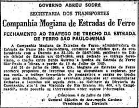 ACIMA: A partir de 13 de julho de 1969 o tráfeo será fechado entre as estações Bento Gonçalves e Ipaúna, bem como a estação de Serra Azul, todas da antiga E. F. S. Paulo-Minas (O Estado de S. Paulo, 5/7/1969).