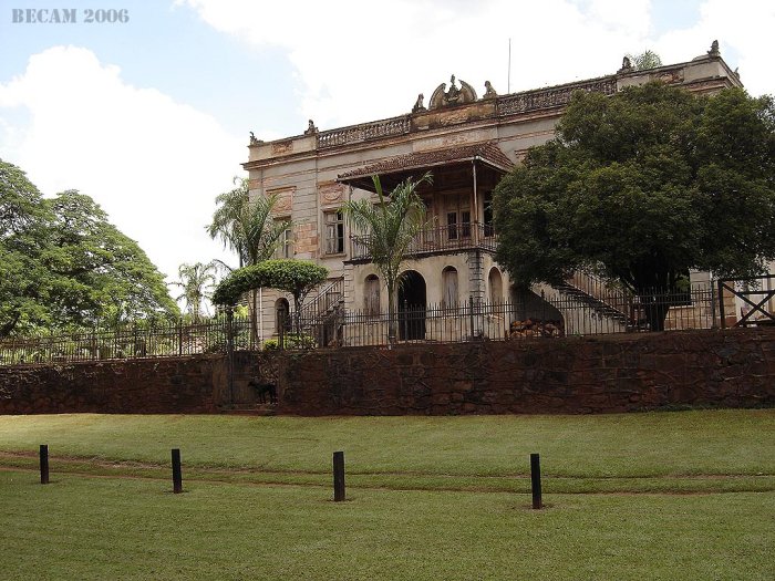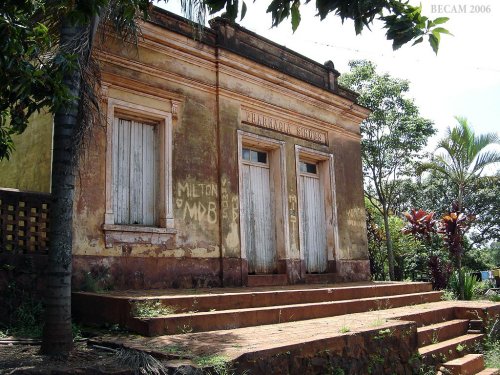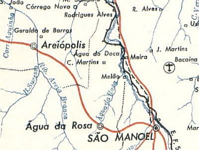 ![]() Mapa do IBGE, c. 1956, mostrando a estação, ao norte da cidade de São Manuel, neste município. Note-se que a leste da estação existe um outro lugarejo com o mesmo nome. Outra fazenda? A Fazenda Simões está bastante próxima à estação, com tudo abandonado. Um local lindo. ![]() ACIMA: Casarão da Fazenda Simões, situado próximo da estação de Rodrigues Alves. ABAIXO: Uma das escadas externas e uma escadaria interna de madeira (Fotos Adriano Martins, 2006). ![]() ![]() ![]() ![]() ACIMA: Junto à estação, o velho armazém da Sorocabana, também abandonado. Acima, no alto de um barranco próximo à estação ferroviária, uma velha casa de turma da ferrovia (foto do autor, em 1999). ![]() ![]() ![]() ![]() ACIMA: Casa e capela na fazenda Simões. ABAIXO: Escola da estação (Fotos Adriano Martins, 2006). ![]() Para saber mais sobre a estação de Rodrigues Alves, clique aqui |
