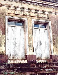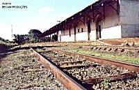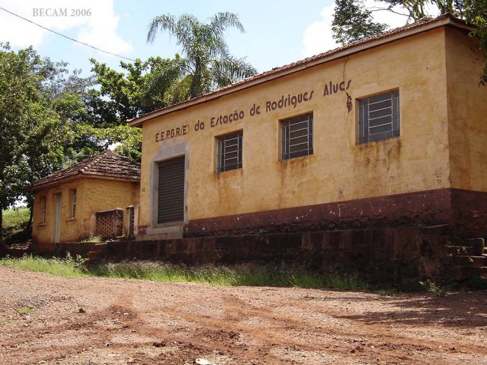 "Estou lhe enviando fotos de um local que se tornou fantasma. Em junho de 2001, estive em Rodrigues Alves. Ao lado da estação há uma colônia de casas de cores amarelas, desbotadas pelo tempo. Chamou-me a atenção um prédio com a seguinte escrita na fachada: Pharmacia Simões. Pela ortografia, imaginamos a antiguidade do local. Na colônia inteira, não havia uma viva alma, tudo totalmente fantasma. Hoje não sei exatamente se há pessoas morando por lá" (Adriano Martins, 2002). A estação foi inaugurada em 1897, em terras do poderoso político e futuro Presidente da República, Rodrigues Alves, daí o nome. À sua volta se formou uma vila que se confundia aparentemente com as colônias da fazenda. Tanto que o mapa do IBGE de 1956 mostra um lugarejo não muito distante da estação, com o mesmo nome. Depois que a região foi se esvaziando, com a troca da cultura de café por cana, os trens de passageiros também deixaram de passar (em 1976) e hoje o local está completamente abandonado. De tempos em tempos, alguém vem e ocupa o prédio da velha estação. "Neste lugarejo havia duas vendas,uma igreja, uma escola e uma farmácia. A fazenda que começa ao lado da estação chama-se Saltinho e pertencia à família do Coronel Amando Simões; sua principal cultura era o café. A fazenda que começa na parte da frente da estação chama-se São João e era da mesma família. Até alguns anos atrás ainda moravam famílias na colônia e na casa do administrador. Há ainda uma casa no melhor estilo "barões do café" na fazenda, que por sinal estava sendo restaurada. Meu avô foi contador desta fazenda durante mais de 40 anos e minha avó era professora na escola". (Luís Fernando Alves da Silva, 03/07/2002) Ralph M. Giesbrecht, abril de 2002 *A