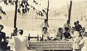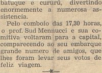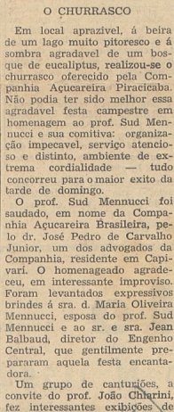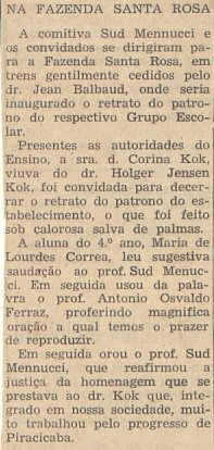 ![]() O mapa do I. H. G. SP de 1942 mostra a área urbana de Piracicaba e a Fazenda Santa Rosa, do outro lado do rio, a nordeste da cidade ![]() A chegada dos homenageados à fazenda no dia 22/04/1944. Foto dos arquivos do autor ![]() ![]() Banquete, homenagens... mesmo dia. Foto dos arquivos do autor ![]() Mais banquete, à beira do rio Piracicaba. Foto dos arquivos do autor ![]() O Grupo Escolar Dr. Kok, em foto publicada no jornal O Estado de S. Paulo, de 22/04/1944. Ficava em terras da fazenda Santa Rosa e seu nome homenageava o francês que dirigiu a fazenda e o Engenho Central por muitos anos. Foto dos arquivos do autor ![]() ![]() Ao lado do Grupo Escolar, em 09/06/1946, o ensino rural da época. Foto dos arquivos do autor ![]() ![]() Ainda o ensino rural... Foto dos arquivos do autor ![]() ![]() ![]() S. Paulo de 22/04/1945 mostra uma visita à fazenda para homenagem ao Prof. Sud Mennucci, Diretor-Geral do Departamento de Ensino do Estado e natural de Piracicaba |