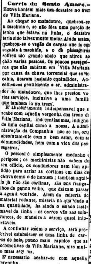 AO LADO: Em maio, um acidente na entrada da estação do Matadouro causa revolta nos passageiros (O Estado de S. Paulo, 24/11/1891). |