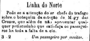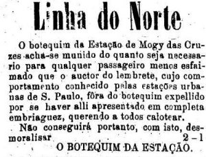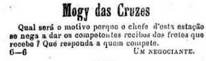 AO LADO: Leitor do joirnal queixa-se do botequim da estação... E, se havia botequim, já existia uma estação em Mogi (A Provincia de S. Paulo, 28/08/1879). |