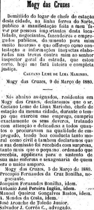 AO LADO: O chefe da estação é prestigiado pelos seus usuarios. Há muito mais assinaturas do que as que constam neste recorte (A Provincia de S. Paulo, 28/7/1879). |