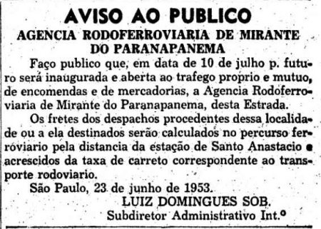 ACIMA: Enquanto a linha não chegava à cidade, em 1953 abriram uma agência rodoferroviaria em Mirante do Paranapanema, para receber cargas (O Estado de S. Paulo, 25/6/1953).