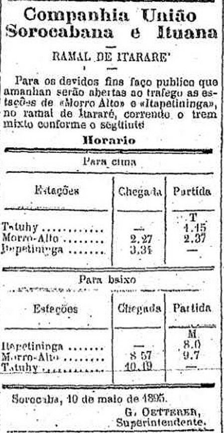 ACIMA: As estações de Itapetininga e de Morro do Alto, um bairro rural do município, foram inauguradas no mesmo dia, em 11 de maio de 1895, junto com a inauguração do ramal que ligava Boituva a Itapetininga, mais tarde chamado de ramal de Itararé. Este trem misto do primeiro dia de operação não chegou a Boituva, não se sabe porque (O Estado