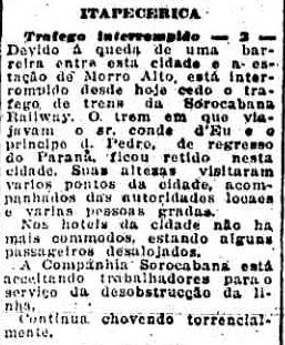 AO LADO: O trem fica preso perto de Morro do Alto tendo como passageiros o Príncipe Pedro e seu pai, o Conde D'Eu, que visitava o Brasil pela última vez antes de morrer no ano seguinte. NOTA: O local é Itapetininga e não Itapecerica (O Estado de S. Paulo, 4/2/1921). |