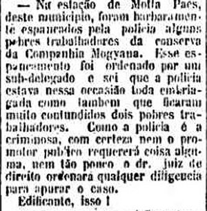 AO LADO: Violencia em Mota Paes (O Estado de S. Paulo, 10/4/1903). |