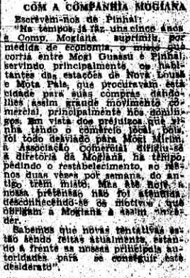 AO LADO: A supressão do trem misto do ramal de Pinhal prejudicou os habitantes de Mota Paes e de Nova Lousã (O Estado de S. Paulo, 11/7/1941). |