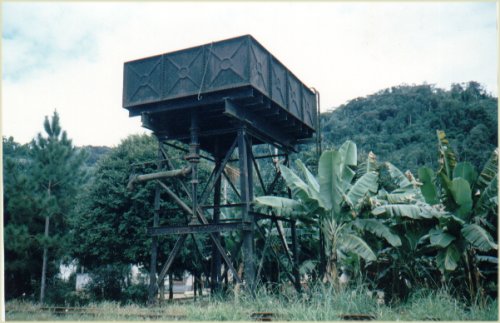 Ao seu lado existe uma caixa d'água de ferro, antiga e muito bonita.
