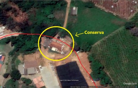 ACIMA: Em 2022, o leito da antiga linha (em vermelho), com estação e a conserva (Google Maps)