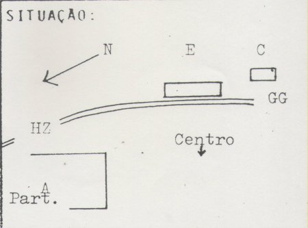ACIMA: Esquema do patio de Monte Santo com as construções existentes em 1986 (E-estação, C - casa e A Part - armazem particular) (FEPASA: Relatório de Instalações Fixas, 1986).