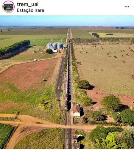 ACIMA: Vista aérea da estação de Irara e o pátio ferroviário em 2021 (Foto trem_uai/Instagram em 10/08/2021).