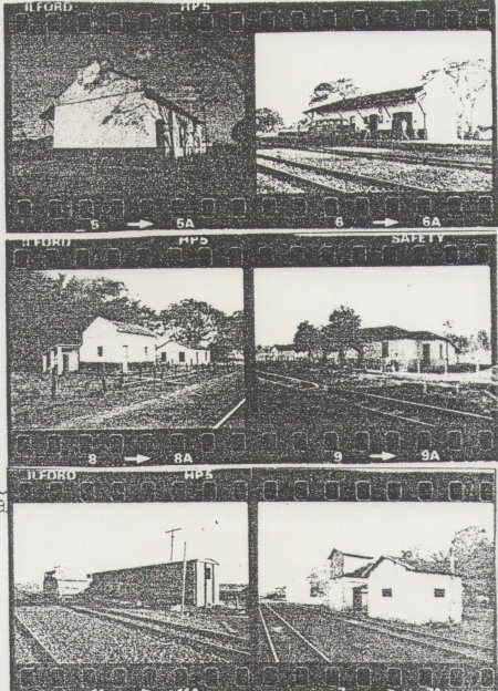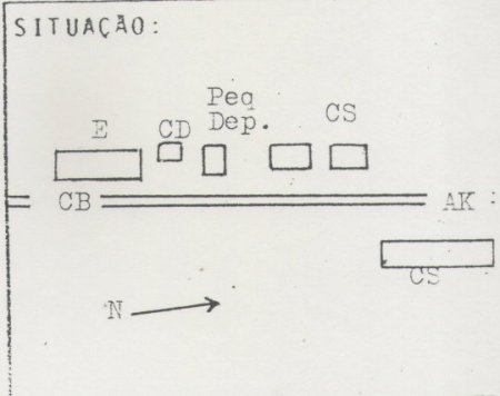 ACIMA: Esquema do patio de Irara com as construções existentes em 1986 (E-estação, CS - casas de serviços(?), CD - caixa d'água, Peq, Dep.- Pequeno depósito (FEPASA: Relatório de Instalações Fixas, 1986).