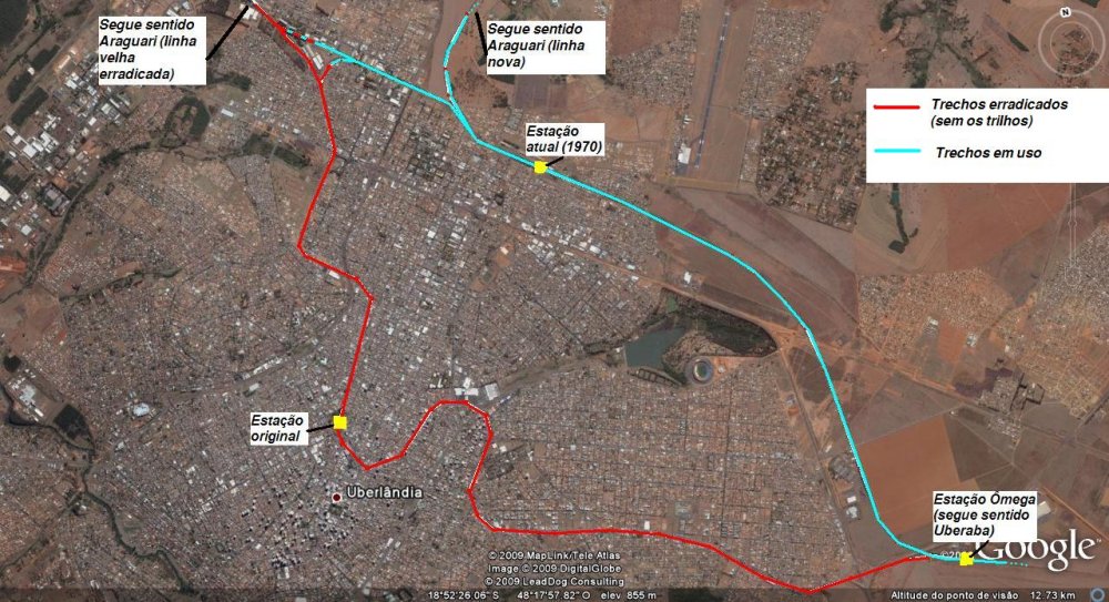 e nova (azul) da Mogiana em Uberlândia (Desenho sobre foto Google: