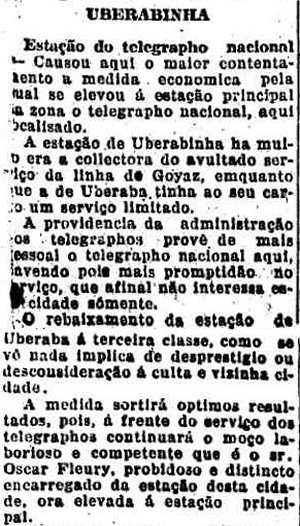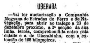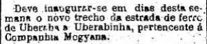 AO LADO: Nota sobre a inauguração da estação de Uberabinha dali a um mes. No entanto, a estação somente seria entregue mais de um ano depois da previsão(O Estado de