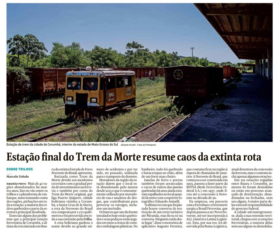 ACIMA: Pátio da estação de Corumbá em 2022 e seu abandno atual em artigo de Marcelo Toledo em 19/06/2022 na Folha de S. Paulo - CLIQUE SOBRE A FIGURA PARA LER O ARTIGO EM TAMANHO MAIOR