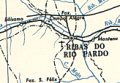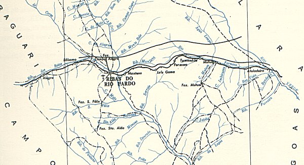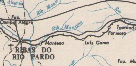 ACIMA: O mapa do município de Ribas do Rio Pardo nos anos 1950 mostra a estação central, a de Luiz Gama e a de Formoso (IBGE: Enciclopedia dos municípios do Brasil, 1960).