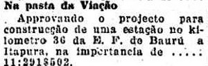 AO LADO: Agora saiu a ordem para a cpnstrução de um prédio para a estação (O Estado de S. Paulo, 26/01/1917). |