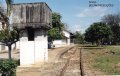 A caixa d'água, e, ao fundo, a plataforma da estação,