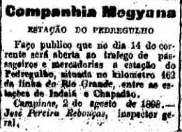 AO LADO: Anunciando a abertura da estação de Pedregulho no dia 14 de agosto (O Estado de S. Paulo, 6/8/1898). |