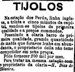 AO LADO: Perus exportava tijolos para São Paulo via ferrovia (O Estado de S. Paulo 5/5/1891). |